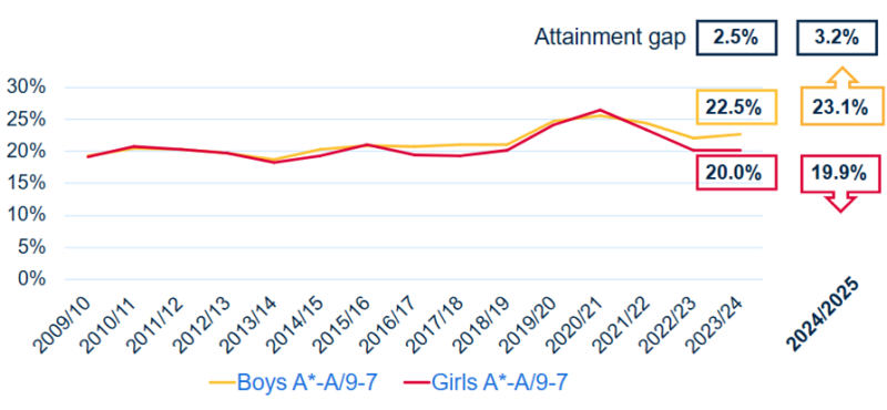 - In 2025, 18.0% of boys taking A level achieved the A* grade, vs 14.8% of girls.