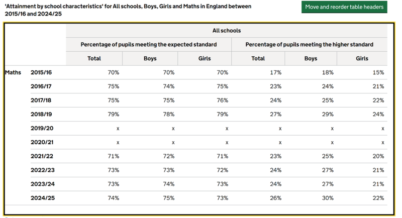 v Department for Education (2025): Create your own tables on key stage 2 attainment - Explore education statistics - GOV.UK, accessed Sept 2025