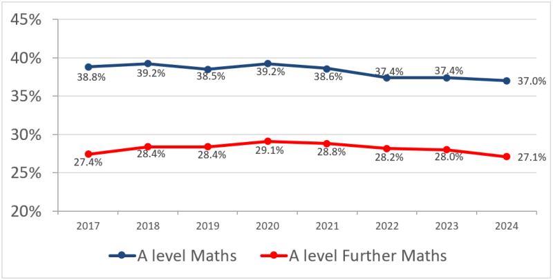 - In 2024 29.3% of boys taking A level Further Maths achieved the A* grade, vs 26.5% of girls.